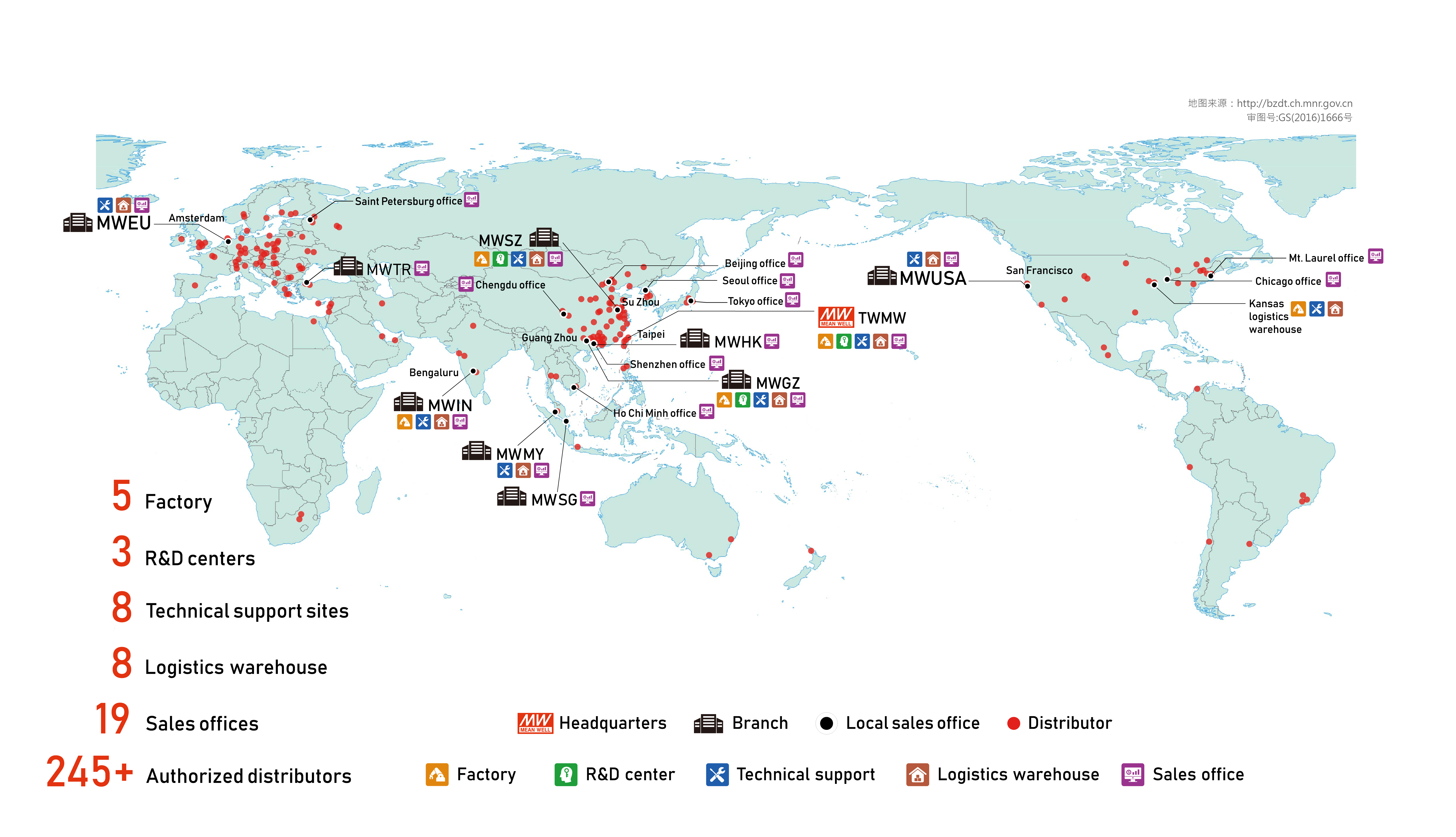 自創(chuàng)立以來,明緯即以「心懷善意」的精神,及「信賴伙伴」的信念持續(xù)與客戶、供應(yīng)商、協(xié)力廠及員工保持長期的合作關(guān)系,我們藉由與全球上百家授權(quán)經(jīng)銷商建立的堅強伙伴關(guān)系,穩(wěn)定地成長與茁壯,2024年已成為合并營收達10.22億美金 以上的專業(yè)電源品牌制造商,全球總部位于臺灣新北產(chǎn)業(yè)園區(qū),在廣州、深圳、蘇州、美國(加州/密蘇里州/紐澤西州)、歐洲荷蘭、印度、新加坡、香港、馬來西亞以及土耳其皆設(shè)有分公司及辦事處,全球員工人數(shù)達2500人。目前擁有5座生產(chǎn)基地,分別位于臺灣地區(qū)新北市、廣州花都區(qū)、蘇州市相城區(qū)、印度邦加羅爾以及美國堪薩斯城。