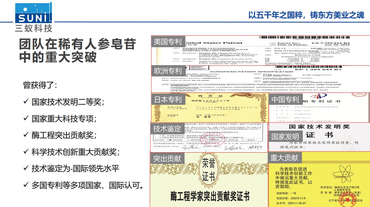 成果:原創(chuàng)四種人參皂苷酶,將野山參最優(yōu)秀的成分,放大生產(chǎn)出百萬倍人參精粹,細(xì)分靶向,解決敏感肌、脫發(fā)、濕癢、老化困擾。