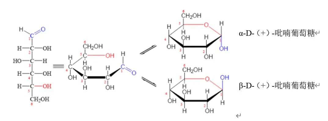 葡萄糖雖然是直鏈的含有端位醛基的還原糖,但 葡萄糖的5位羥基和1位醛基易縮合成六元環(huán)的半縮醛,我們稱之為吡喃糖。然后根據(jù)1號(hào)位羥基的構(gòu)型,分為α吡喃糖和β吡喃糖。(此處的構(gòu)型是手性的體現(xiàn),如果一個(gè)多碳有機(jī)物某C原子上面連的四個(gè)基團(tuán)都不一樣,這個(gè)C具有手性)