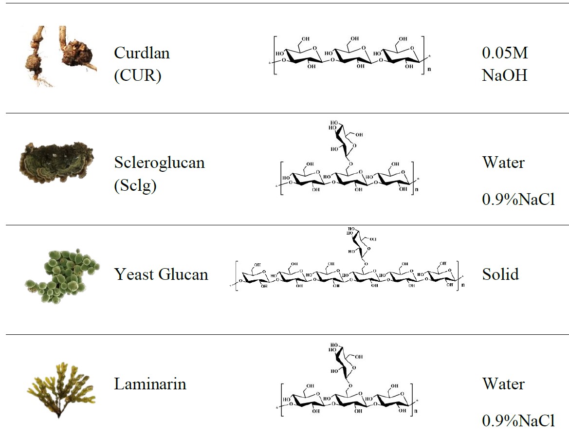 從上到下(下圖表1),依次是香菇多糖(Letinan)、裂裥菌素(Schizophyllan)、黑木耳多糖(Auricularian)、可得然膠(Curdlan)、小核菌膠(Scleroglucan)、酵母葡聚糖(Yeast Glucan)、海帶多糖(Laminarin)、竹蓀β-葡聚糖(β-glucan from Dictyophora)、木質(zhì)素(Xylan)、Cinerean(真菌葡聚糖)