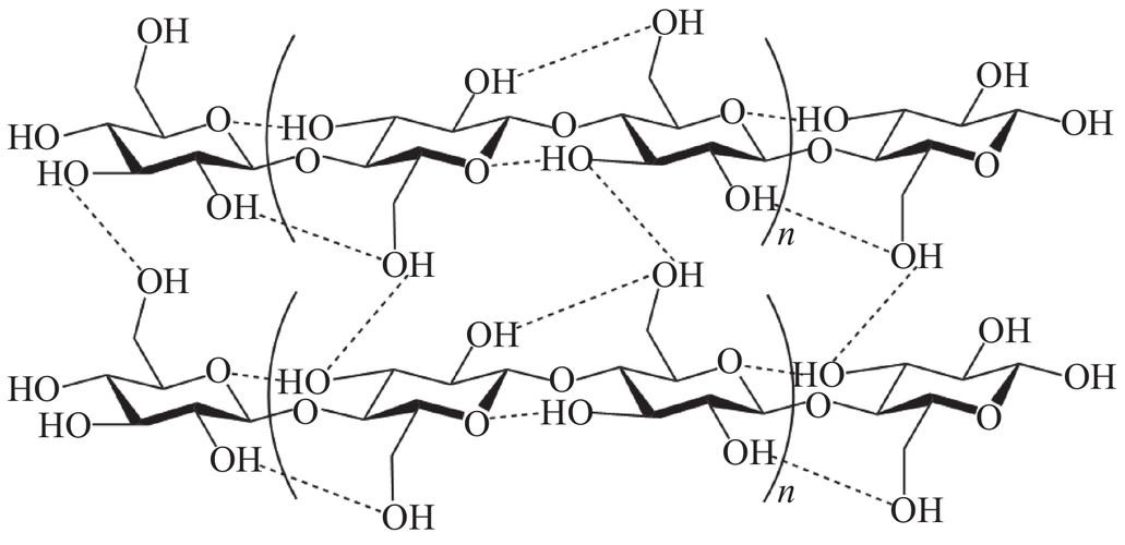 纖維素大分子的基環(huán)是D-葡萄糖以β-1,4糖苷鍵組成的大分子多糖,見(jiàn)圖4.由于纖維素特殊的構(gòu)型,纖維素的分子與分子之間的-OH都形成了氫鍵,使之無(wú)法溶于水,所以我們?nèi)粘V惺褂玫降闹饕囚燃谆w維素鈉、羥乙基纖維素、羥丙基纖維素等經(jīng)過(guò)改性的纖維素,使之溶于水。