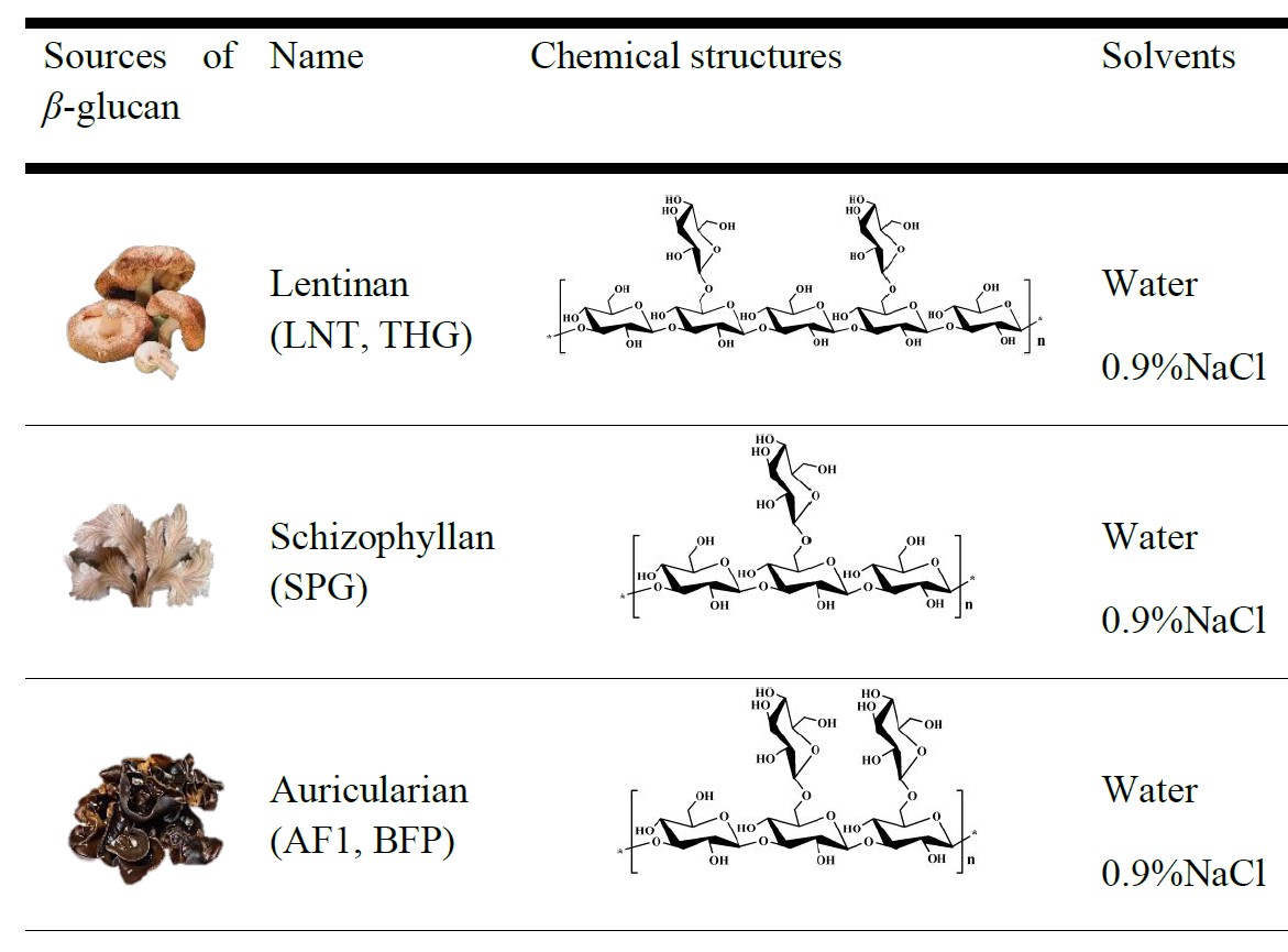 表 1. 溶液中幾種三螺旋β-(1,3)-D-葡聚糖的來(lái)源和化學(xué)結(jié)構(gòu)